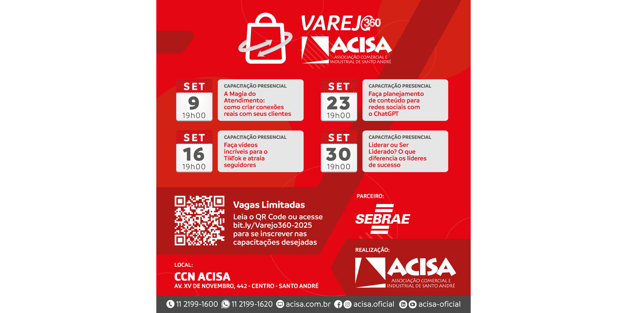 Atenta a essa realidade, a ACISA – Associação Comercial e Industrial de Santo André mantém uma programação diversificada de cursos e palestras voltada à classe empresarial, em sua maioria gratuitos. Entre as iniciativas, destaca-se a trilha de treinamento Varejo 360º, promovida pela Academia de Negócios e Inovação da entidade, em parceria com o Sebrae-SP, que chega à sua segunda edição.