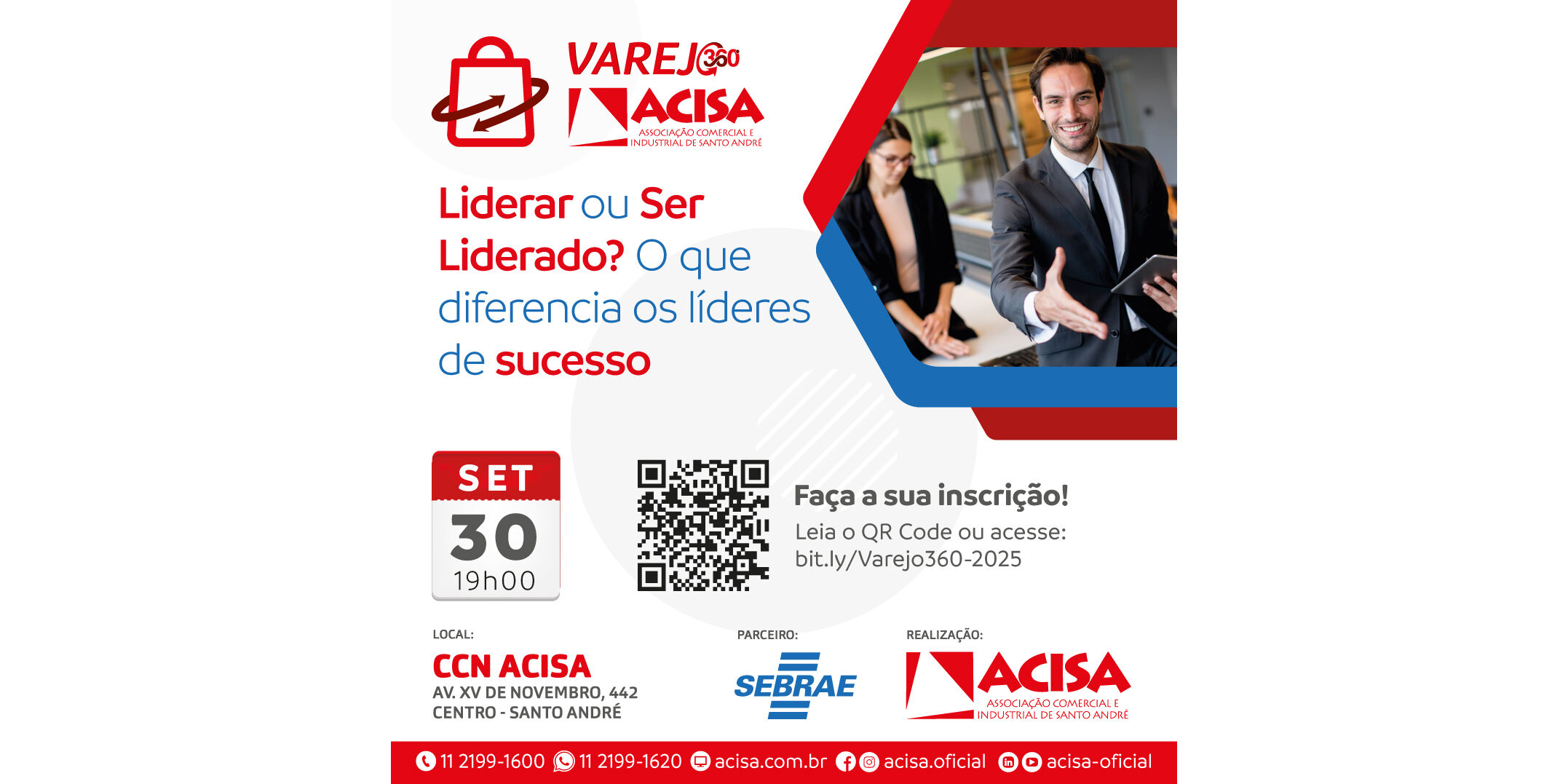 Sobre a ACISA: com mais de 4 mil associados, a entidade está localizada na Avenida XV de Novembro, 442 – Centro – Santo André e conta com estacionamento próprio. Sua diretoria é formada por empresários que dedicam parte de seu tempo ao trabalho voluntário em prol do associativismo, contribuindo para o fortalecimento da classe empresarial e para a sustentabilidade da entidade.