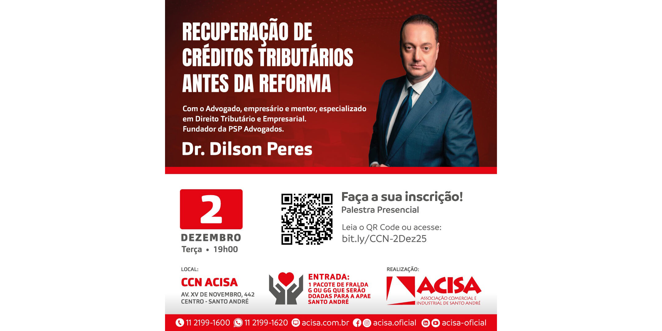 Com a proximidade da implantação da Reforma Tributária, a ACISA – Associação Comercial e Industrial de Santo André promoverá uma palestra especial com o advogado Dilson Peres para orientar empresários e gestores sobre recuperação de créditos tributários.