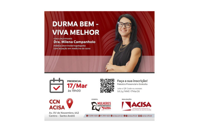 A qualidade do sono e seus reflexos na saúde e na produtividade serão tema de palestra promovida pelo Núcleo de Mulheres Empreendedoras da Associação Comercial e Industrial de Santo André (NME-ACISA). O encontro será realizado na terça-feira (17 de março), às 19h, no Centro de Capacitação & Negócios. A convidada é a médica otorrinolaringologista Milena…