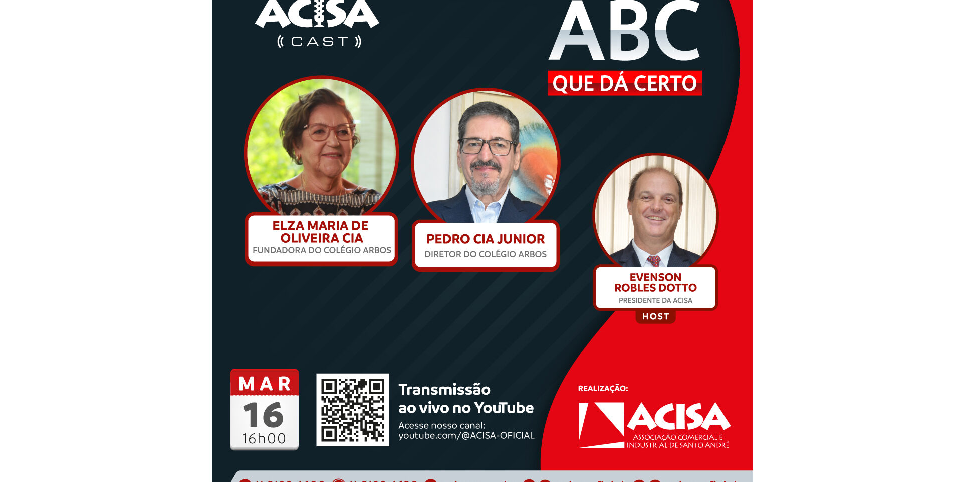 Na primeira edição de 2026, o presidente da ACISA, Evenson Robles Dotto, receberá no estúdio a fundadora do Colégio Arbos, Elza Maria de Oliveira Cia, e o diretor Pedro Cia Junior.