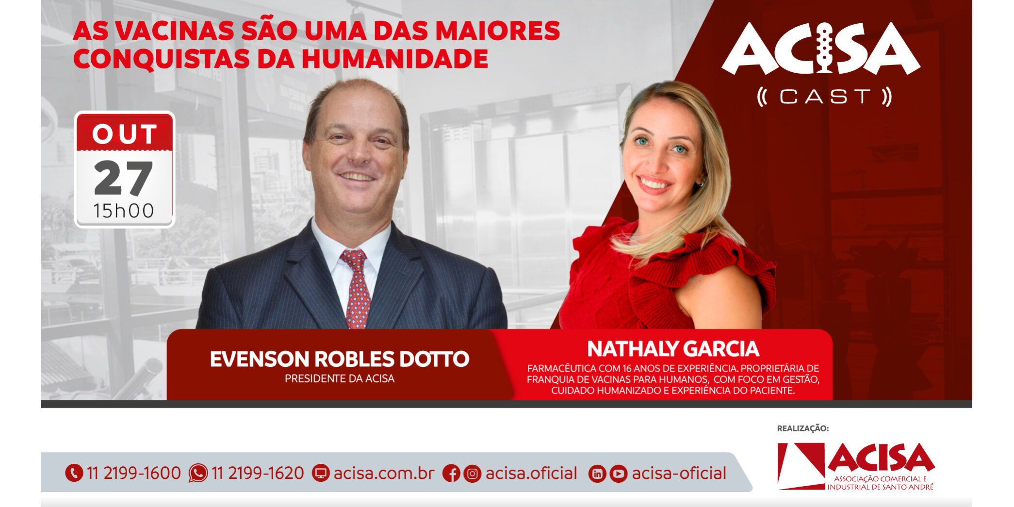 Para debater o poder das vacinas, o próximo episódio do ACISA Cast – podcast da Associação Comercial e Industrial de Santo André – contará com a participação da farmacêutica Nathaly Garcia. A transmissão será realizada na segunda-feira (27), às 15h, pelo canal YouTube.com/@ACISA-OFICIAL, com mediação do presidente da ACISA, Evenson Robles Dotto.