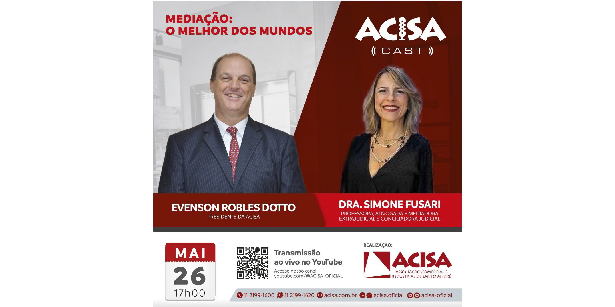 Com o objetivo de apresentar os benefícios e as diversas aplicações da Câmara de Mediação, o presidente da Associação Comercial e Industrial de Santo André (ACISA), Evenson Robles Dotto, conduzirá um podcast especial com a advogada e professora Simone Fusari. A transmissão acontecerá ao vivo na segunda-feira, 26 de maio, às 17h, pelo canal do YouTube: youtube.com/@ACISA-OFICIAL.