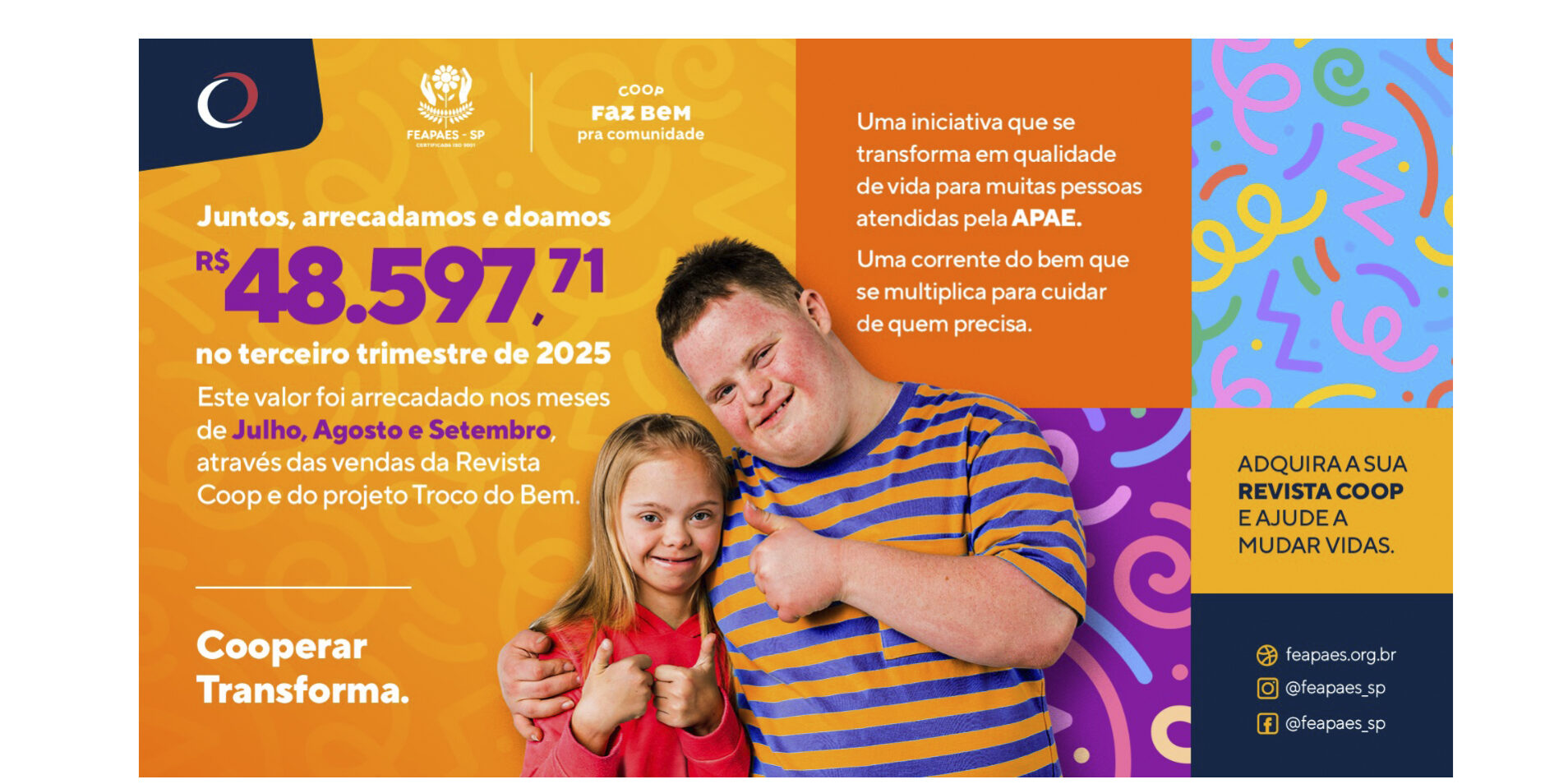 Entre essas iniciativas estão o Troco do Bem e a Revista Coop, que fazem parte da plataforma de responsabilidade social Coop Faz Bem, na vertente Coop Faz Bem pra Comunidade, e visam apoiar a Federação das APAEs do Estado de São Paulo (Feapaes-SP), instituição beneficente sem fins lucrativos.